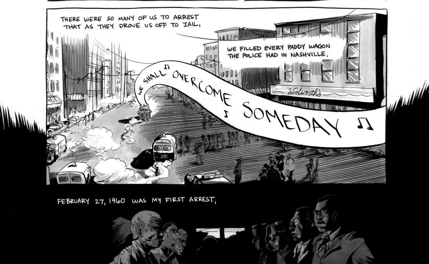 Imagine a young John Lewis in 1958 — 18 years old — having arrived at college, picking up a comic book. Lewis says the comic tuned him in to a greater story: It tells the story of Rosa Parks' symbolic refusal ― but it also gives a detailed account of how to protest nonviolently. It was a lesson Lewis took to heart when he staged sit-ins at segregated lunch counters in Nashville in the late '50s.