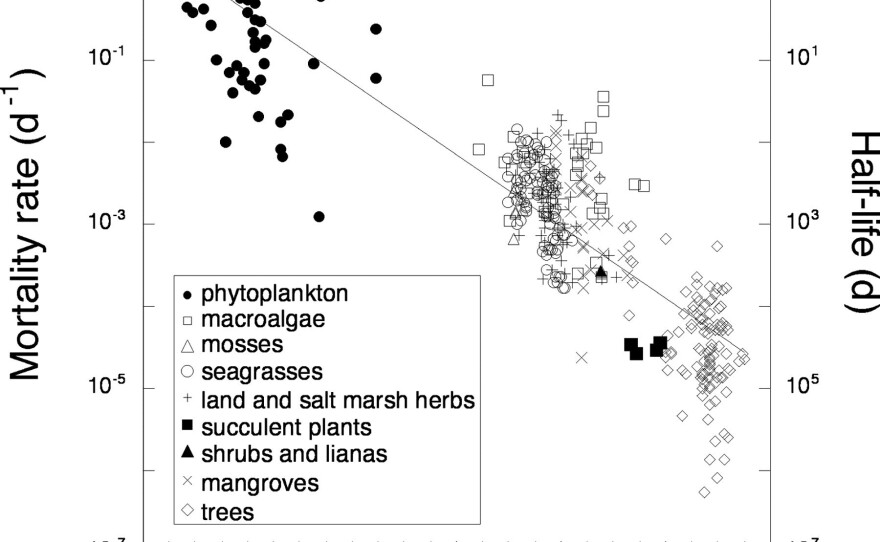 The cells in an elephant do more work in a minute than the cells of a mouse. That's why an elephant cell can beat at a slower rate than the rattatat-tat of a mouse cell. Both wear out after a billion and a half beats, but the elephant does it more slowly. As for the peculiar quarter power scaling differences, that rule emerges from the data when you plot the different lifespans of animals or plants on a graph. Notice how plants, big and small fall along the same quarter-power line? Here it is, from a paper by Marba, Duarte and Agusti, cited in my blog post.