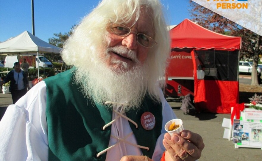 A local Santa has gone from pushing candy canes to encouraging healthy eating. He is bringing others along with him. As part of our first-person series we hear from Santa himself. What we aim to do, it sounds a little bit ambitious but what we aim to do is change the eating culture of America from the fast food in the processed food which we have gotten in the habit of eating to eating real food and living a sustainable lifestyle. [ Music ]. My name is sustainable sentiment the Vista farmers market in the parking lot in front of the courthouse in Vista, California. I used to be a mall Santa and when I finally woke up and got healthy and lost 80 pounds, the people that I worked for made me where able to get the American Santa image of the heavy guy. Decimate me pass out candy canes and M&M peanuts and I thought this makes no sense at all. What really put me over the edge was, I would be lifting 60 pound four-year-olds into my lap for the Christmas picture. Talk about childhood obesity and you say it is a real problem. Unless you have a conga line of four-year-olds that you can barely, fairly strong for 75 years of age but barely get them up into your lap, it really comes on. About on the childhood obesity crisis to me in spades. Without there had to be another way, a dozen location and another message and that is why we settled on the farmers markets. I know have sent us all over the state of California. I have seven Santos just like me in 12 farmers markets in San Diego County alone. You cannot talk about healthy eating in the mall with the courts and pencils down the hallway etc. Farmers markets you have proud organic farmers who have raised lovingly their crops forgive people who have lovingly raised the animal meats, chicken and things like that. You have a lot of proud people in the farmers market you are just as anxious as we are to have healthy kids. The farmers market is the place where health and happiness lives. Rule number one goes to the fact that American children eat out of boredom, habit and something to do. They go to 7-Eleven empyema back ace -- buy a slur piece.'s belief you are hungry even Apple. You do not want an Apple? If you are not hungry to eat an apple then you're probably not hungry and the thought will pass. Keeps you from putting things him out just for the sake of doing it. The S you. No soda, no second helpings, no between Mel Sachs, no added sugar, salt and no sweets except on possibly days that begin with the letter S. What happens is the food rules are designed to get the kids to break away from the fast food comes the junk food in the process food which is loaded with sugar. As they go run on December the farmers are giving you a taste of real fresh food. They love the treasure hunt. We send them out looking for Santos garden bites and that is where the vendors sample healthy tastes of whatever it is they are selling. The Love looking for the little symbol. When they find it, they taste it, turn replica mom and say, it was green or yellow but it tasted good. [ Music ]. The problem is very simple. First of all it is not the problem of childhood obesity. Everyone talks about it but the fact of the matter is that the illnesses that obese adults and children's get the same illnesses that nonobese children get. 80% of the people, children or adults who are obese will get in life-threatening disease that is driven by a bad diet. 40% of those who are slender will also get the same diseases and that is because of all of the sugar in the processed food. All of the additives that are in the processed food. All of the arsenic in the antibiotics that are in the chickens at all of the fast food places. That adds up to an annual expenditure of $1.4 trillion a year in medical costs. $1.4 trillion of unnecessary spending if we only ate right. I have been here since the bank weeks before Thanksgiving. I have had one child come back every farmers market just to tell me how they have been eating that week. That makes it all worth it. What have you been eating? Carrots, apples, broccoli. Do know what is so good about broccoli? If we eat it raw, when you break it off it looks like little trees. If you notice that? That was sustainable stented, Richard exhibit the songs you heard where -- the piece was produced by our mid-18 producer route. -- Broke route. Join us again tomorrow for KPBS Midday Edition at noon. Will need a new city councilmember Georgette Gomez and get a taste of the San Diego book awards but remember if you ever miss a show check out the Midday Edition podcast.