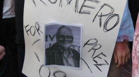 Pani Musquiz carries his presidential campaign sign at World Zombie Walk. (Beth Accomando)
